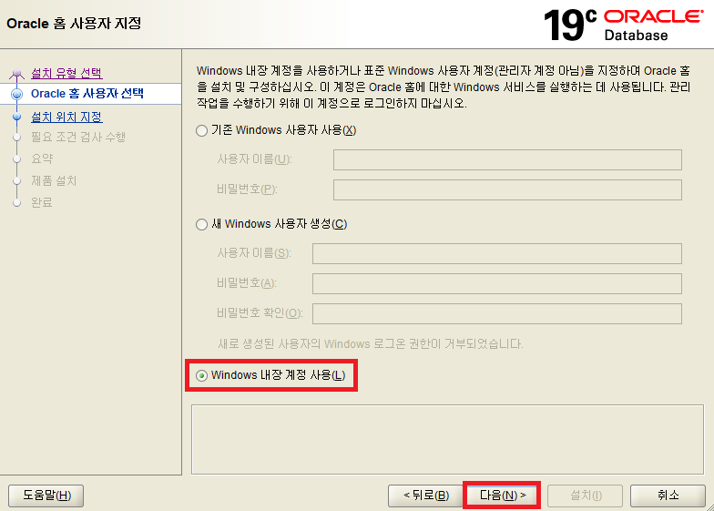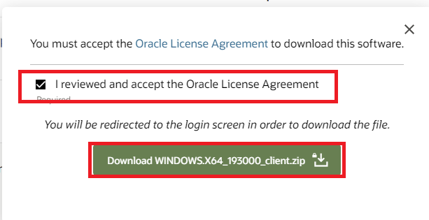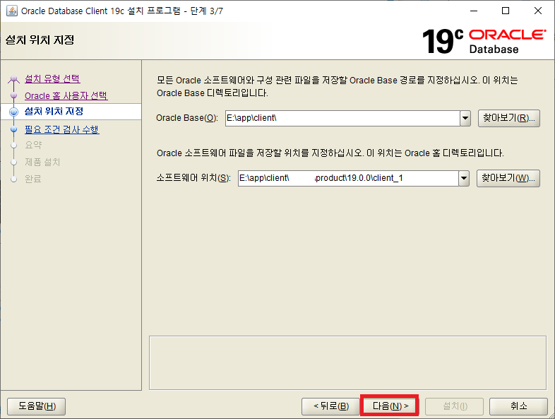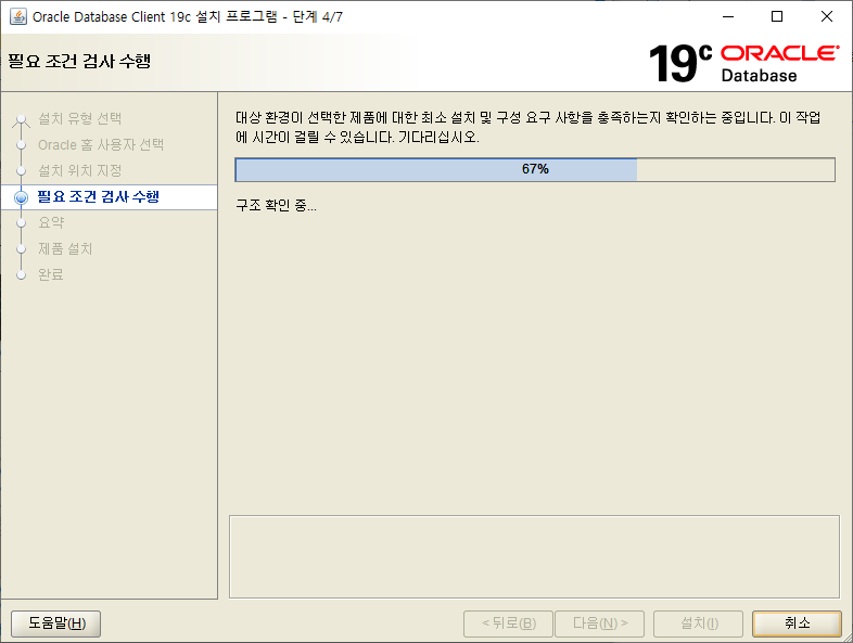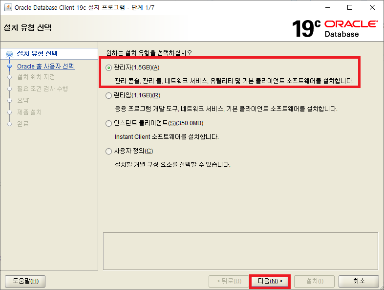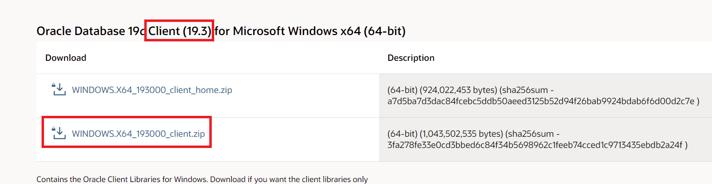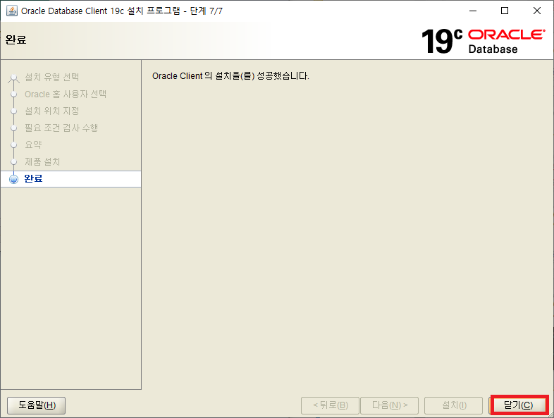 다운로드 : 클라이언트 내장( https://www.oracle.com/kr/database/technologies/oracle19c-windows-downloads.html )