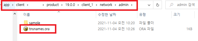 설치된 클라이언트 HOME/network/admin에 가서 tnsnames.ora 파일 생성