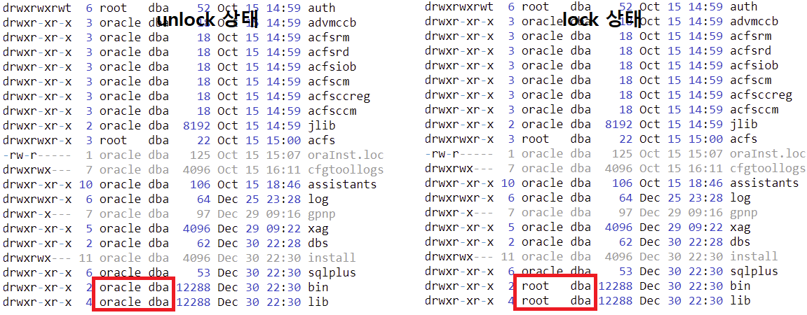 oracle(grid):dba 면 unlock 상태이고 root:dba 이면 lock 상태임)