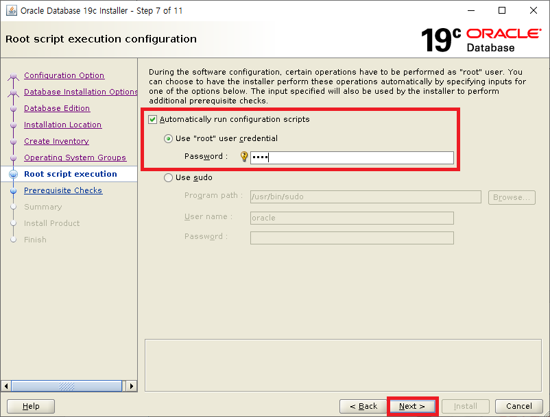 설치 중 root 권한으로 스크립트 실행하는 부분에서 자동로 스크립트 실행할지 여부 지정 root 패스워드 입력