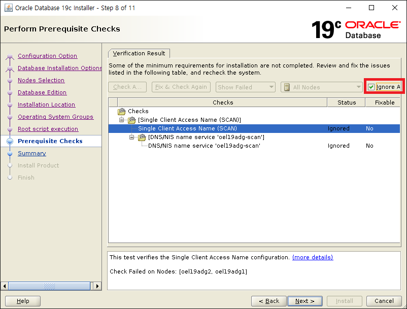 SCAN 관련메세지는 SCAN IP가 DNS에 등록되어 있지 않아서 발생한 문제 모두 Ignore