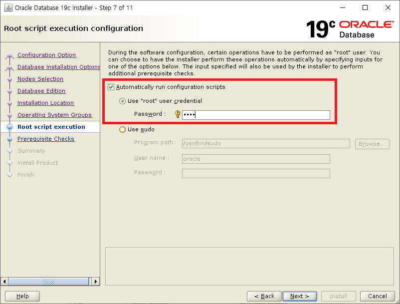 설치 중 root 권한으로 스크립트 실행하는 부분에서 자동로 스크립트 실행할지 여부 지정 root 패스워드 입력