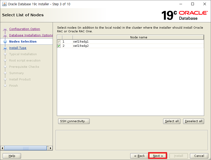 1,2 선택(SSH connectivity는 grid 설치시 진행했으므로 하지않음)