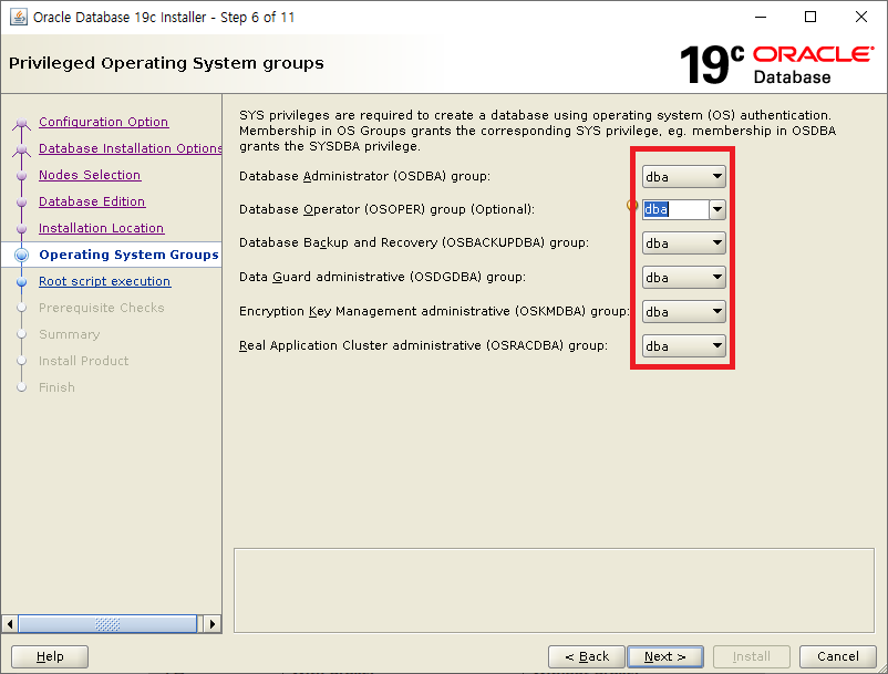 group 는 모두 dba 로 지정