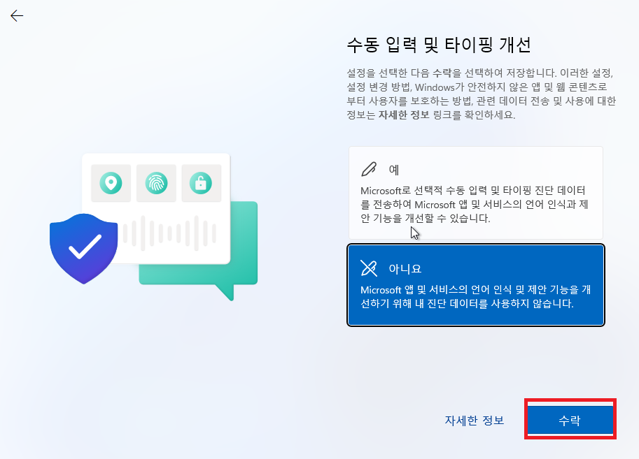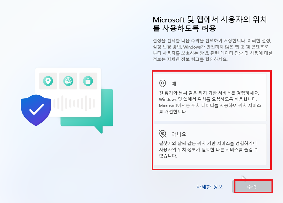 설치 완료 후 재기동 이후 아래 화면에서 한국 선택 후 예 선택