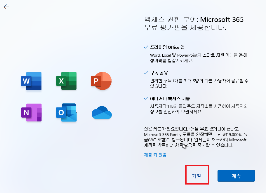 인증키 있다면 입력, 없다면 제품 키가 없음 선택