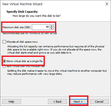 용량 선택 후 Store virtual disk as a single file 선택