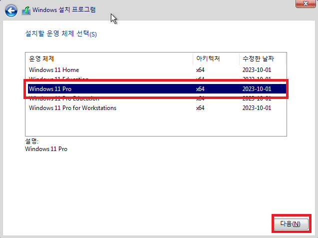 Windows 11 Pro 선택(라이센스 제품에 맞게 선택)