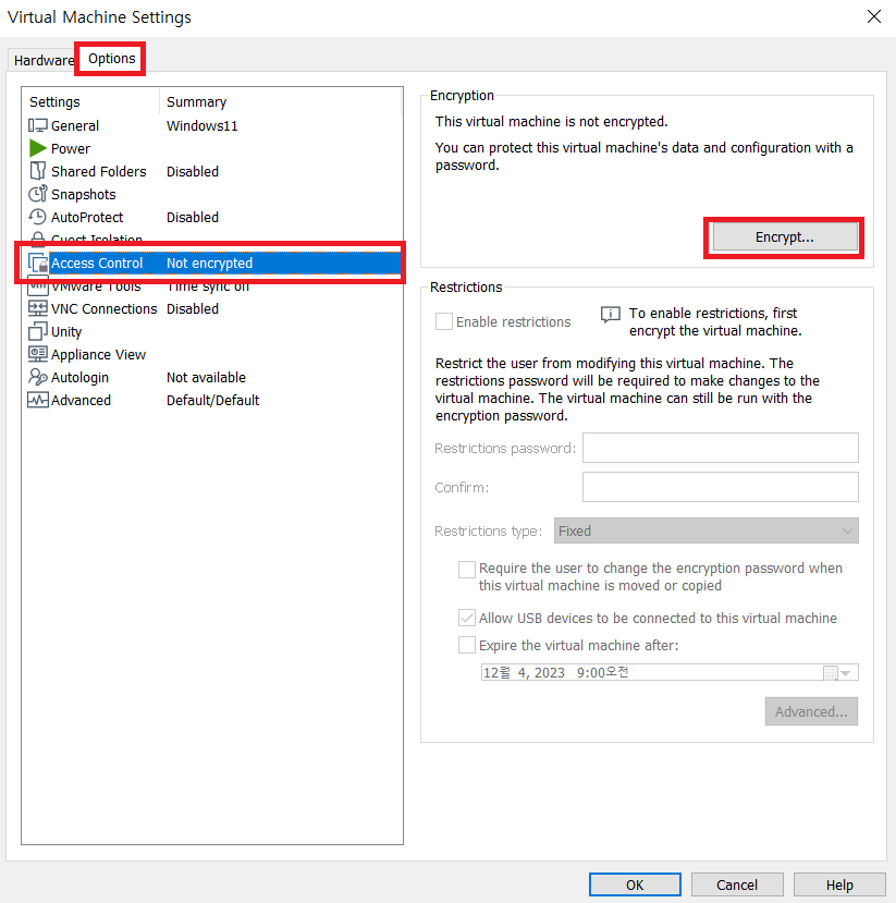Options 에서 Access Control 선택 후 Encrypt 선택