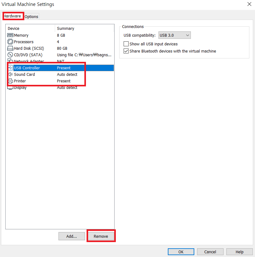 Hardware 탭에서 USB ~ Printer 부분 제거