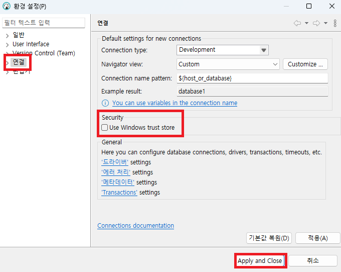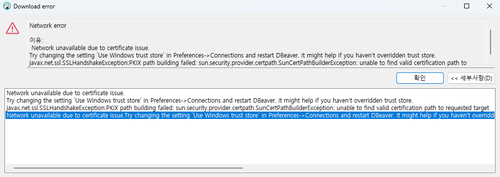 "Use Windows trust store" 체크 해제 후 DBeaver 재기동