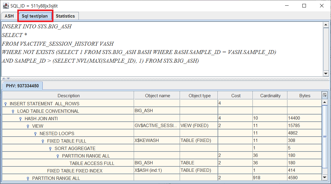 이후 각각 해당 sql의 ash 그래프, sql fulltext 및 sql plan, sql 통계를 확인할 수 있음