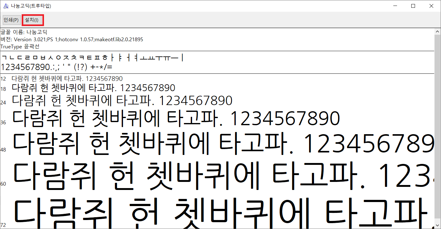 압축 해제 후 나의 경우 나눔고딕체가 필요하기 때문에 나눔고딕 폰트 ttf 파일 4개모두 실행 후 설치